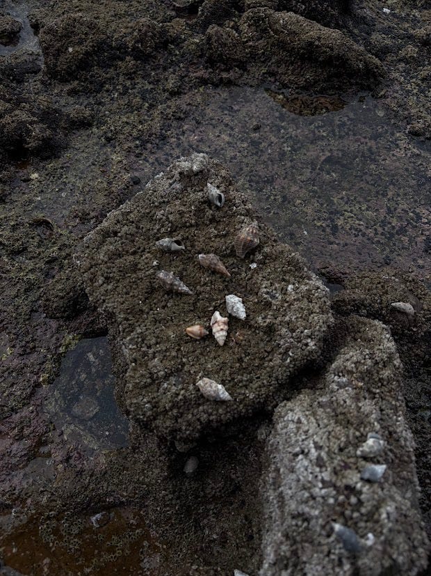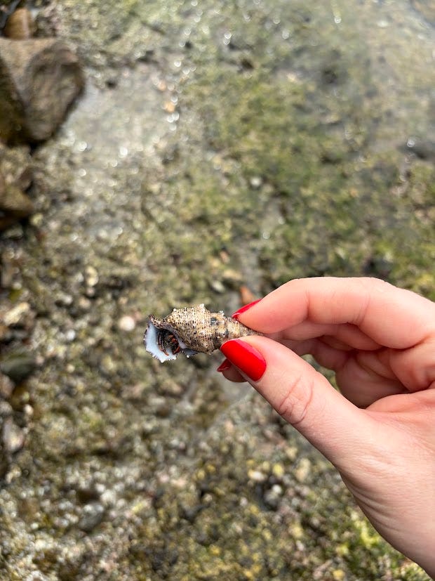 Next day was cloudy and chilly, but made the most of it at the beach. Picked out a million shells and stuffed some in my pocket. A few minutes later I decided to check if they contained anyone inside and discovered they all had baby crabs in them.
